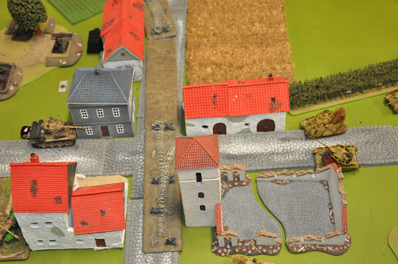 | Panzer Pioneers: I deployed both Pioneer platoons with obstacles into dug in positions with one platoon having a belt of mines or wire stretching from the centre of the table to the very edge. The Tigers went into Ambush with the remainder in reserves. Kampfguppe Piper: Luggs spread his forces out with the intent of pushing all up front. The obstacles proved to be a big problem as his list has nothing that can clear them. The wire wouldn't be a problem for the tanks but would for everything else. | |